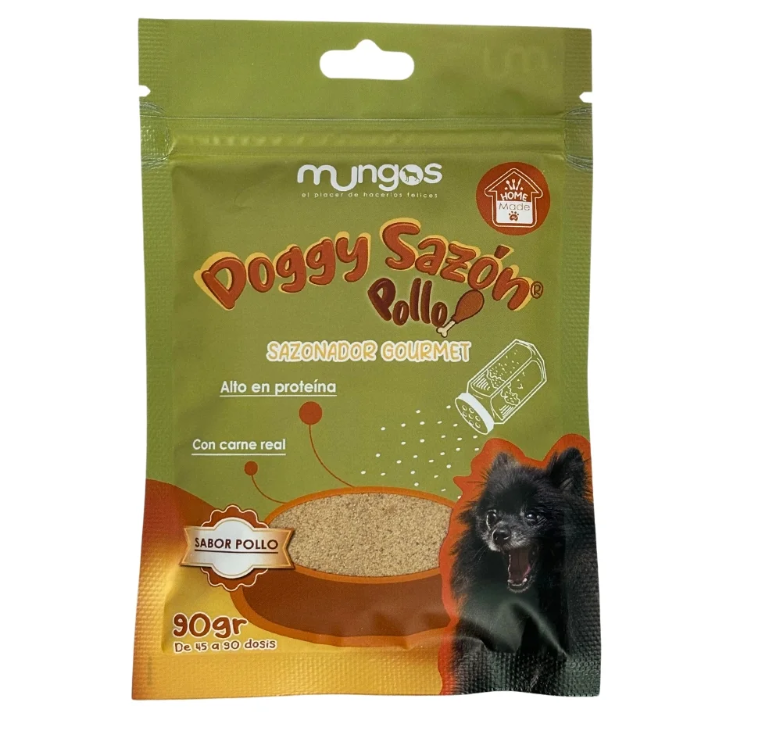 Mungos Doggy Sazon pollo. Deleita a tu mascota con nuestra selección de sazonadores gourmet para perros y gatos. Ingredientes naturales y deliciosos sabores en cada bocado. ¡Nutrición y sabor en perfecta armonía! Apto para perros de todas las razas desde 3 meses en adelante. Cachorros, Adultos, Senior.