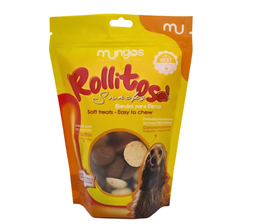 Galletas Rollito Blandas para perros con sabor a carne y pollo, que brindará nuevas sensaciones en el paladar de tu peludo. Es apto para todas las razas. Galletas funcionales Formuladas especialmente para perros de 5 meses en adelante. Enrriquecidos con prebióticos y probióticos.