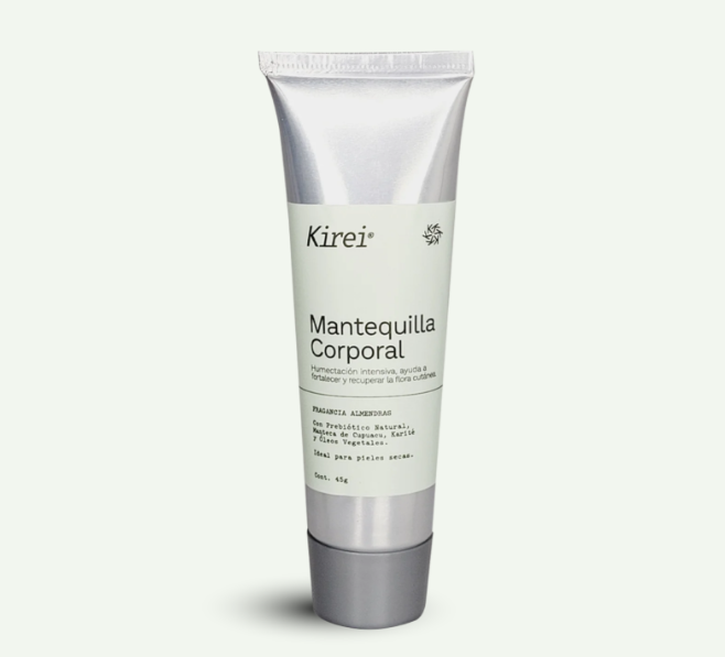La Mantequilla Corporal Kirei es una emulsión rica y ultranutritiva diseñada para restaurar la barrera cutánea, proteger contra agresiones ambientales y proporcionar una hidratación profunda y duradera, sin comprometer la respiración de la piel. Su textura densa pero de absorción eficiente combina ingredientes botánicos y lácteos funcionales con una acción sinérgica en la microbiota, el microbioma cutáneo y la integridad estructural de la piel.